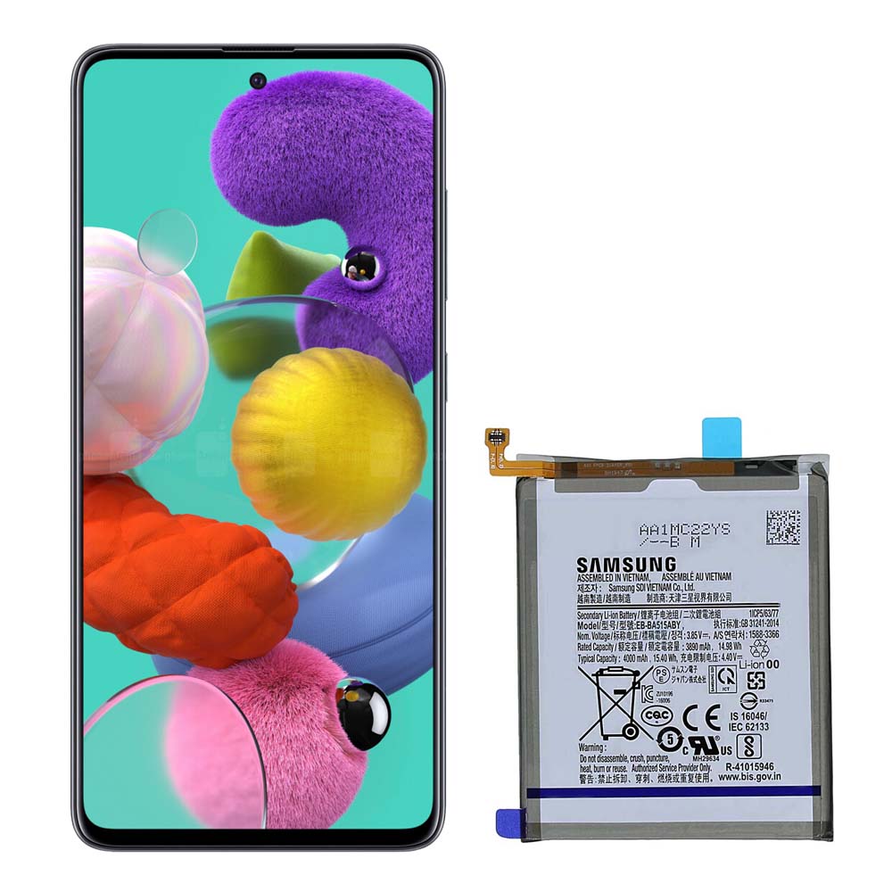 باتری اصلی گلکسی آ 51 سامسونگ دارای ظرفیت 4000 میلیآمپر ساعت (4000mAh) است. نمونههای تقلبی ممکن است ظرفیت کمتری داشته باشند.